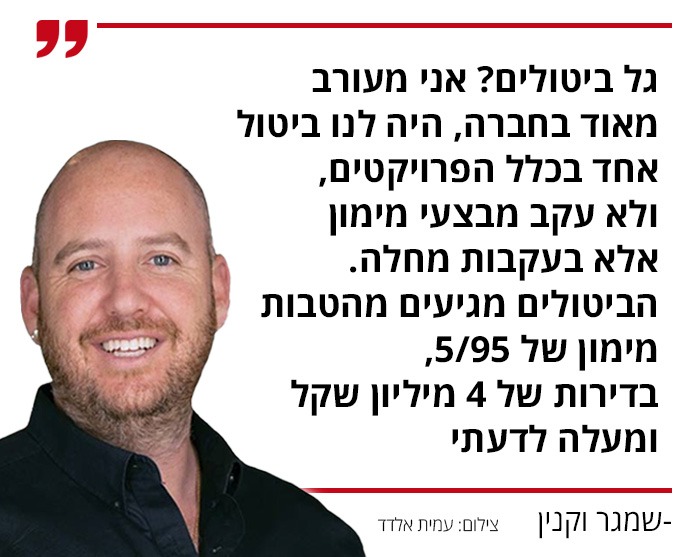 "אני מעורב מאוד בחברה ולדעתי היה לי ביטול אחד, ולא עקב מבצעי מימון אלא בעקבות מחלה. אני לא רואה ביטולים. אני בטוח שגלי הביטולים מגיעים ממקומות של הטבת מימון 5/95 בדירות של 4 מיליון שקל ומעלה. אנשים קנו אופציה מסוכנת מדי. הם חשבו שהמחירים יעלו ב-20%, והם מצאו את עצמם בבעיה. עדיף היה להם לוותר על 5% מאשר לקנות. אנחנו לא שם. עובדתית, לא היה ביטול אחד בגלל סיבה כלכלית. קראתי מה האוצר אומר והאמת שזה מטריד אם התחזית תתממש. אני מקווה שהחברות יהיו מספיק יצירתיות כדי להקל על הרוכש, גם דרך הלוואות גישור. בפריפריה, רוב האנשים קנו אצלי למגורים, לא כהשקעה. היו כאלה, בפרויקטים אחרים, שרצו להרוויח פי 8-9 על הכסף. כשהחלום לא התממש - שם הביטולים".