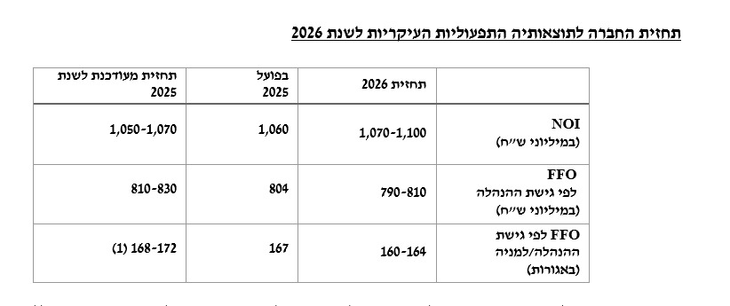 לפי נקודת האמצע של התחזית, ה-NOI צפוי להסתכם ב-1.085 מיליארד שקל - מעט יותר גבוה מהשנה הנוכחית. לעומת זאת, ה-FFO צפוי להסתכם בנקודת האמצע בטווח של 800 מיליון שקל - מעט נמוך מהשנה הנוכחית. כלומר, לפי התחזית של השנה הבאה, החברה צפויה להציג צמיחה דומה לשנה זו.