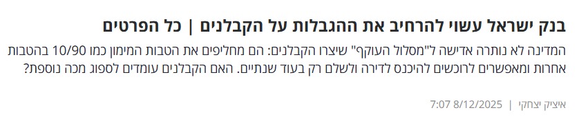 נקודת האיזון העדינה שבין הגנה על יציבות הבנקים לבין מתן בלון חמצן לרוכשי הדירות, תמיד שיחקה תפקיד מרכזי בבואו של הבנק המרכזי לקבוע מגבלות. כעת, הפיקוח על הבנקים מפרסם הוראות חדשות שנוגעות לנוטלי המשכנתאות - ולא בטוח שכולם יהיו מרוצים מכך. המטרה של הבנק המרכזי ברורה: הוא רוצה למנוע מהשוק "להתלקח" מחדש תחת מבצעי מימון אגרסיביים, ובו בזמן לעגן הקלות שיסייעו למשקי הבית לצלוח את תקופת הריבית הגבוהה.