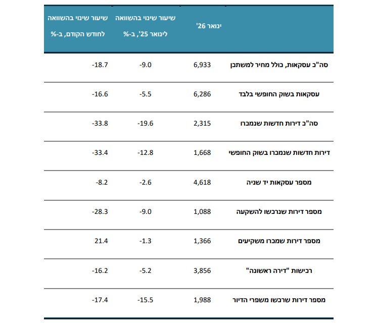 כמה דירות נרכשו בשוק הנדל"ן במהלך חודש ינואר והאם מדובר בירידה נוספת? לפי נתוני אגף הכלכלן הראשי באוצר, בחודש זה נרכשו 6,933 דירות - ירידה של 9% בהשוואה לינואר 2025. באוצר מדגישים כי שיעור הירידה מוטה כלפי מעלה במידה מסוימת, בשל רמה נמוכה במיוחד של מכירת דירות חדשות בינואר אשתקד, על רקע הקדמת רכישות לדצמבר 2025.
