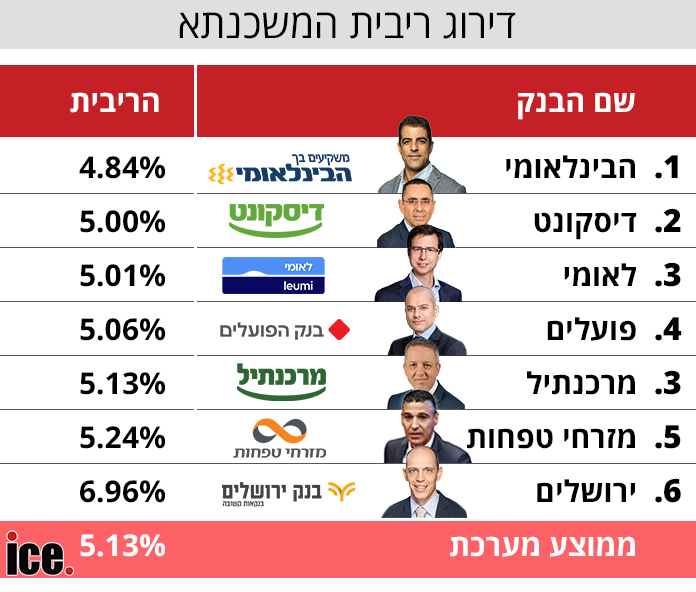 הנתון המפתיע מנתוני ינואר הוא שהבנק הבינלאומי קוטף את הפסגה עם ריבית של 4.84%. אחריו בנק דיסקונט. כלומר, אף אחד משלושת הבנקים הגדולים לא מתיימר להוזיל לכם את העסקה. לאומי ופועלים מעל 5%, וכך גם מרכנתיל ומזרחי טפחות - שהוא הבנק ששולט ללא עוררין בשוק המשכנתא.