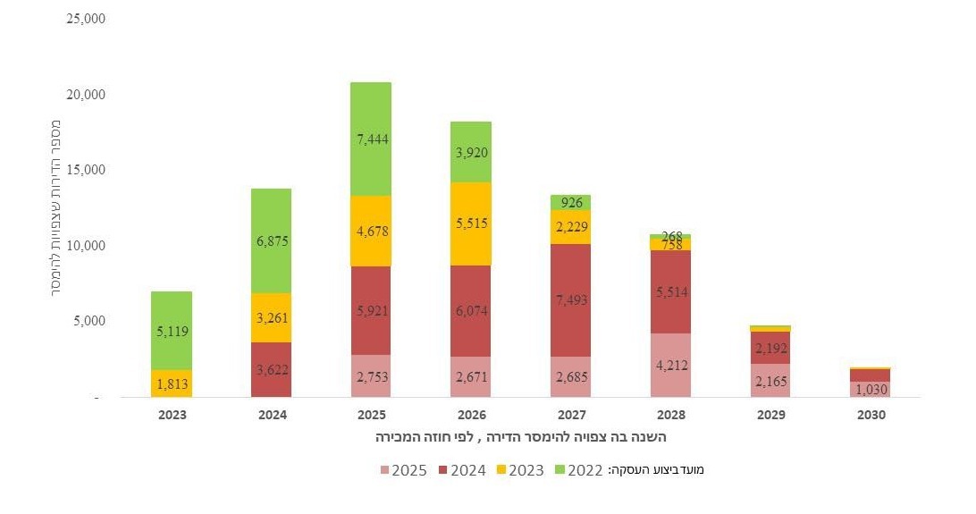 מעניין יהיה לראות האם גל הביטולים שהתעצם במלחמה יימשך לתוך 2026 ו-2027. בטבלה כאן למעלה, אפשר לראות מה הצפי. התחזית פורסמה לפני שהעסקאות האחרונות ל-2025 היו ידועות. אפשר לראות כי כמעט כל הדירות שנרכשו ב-2023 יימסרו כבר השנה. החשש האמיתי של האוצר היה שהטבות המימון ישפיעו על השוק ויגרמו לעלייה משמעותית מאוד בגל הביטולים.