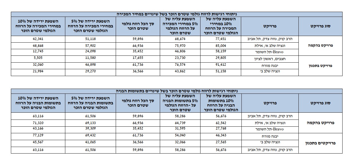 מדוח חברת אלמוגים שפורסם בסוף השבוע אפשר לראות עד כמה משמעותית ההשפעה של מחירי המכירה בפרויקטים על הרווח הגולמי. החברה פרסמה גם נתונים לגבי אפשרות של שינויים בתשומות הבנייה על הרווח הגולמי שלה. בניגוד לבסר, התנודות באלמוגים פחות קיצוניות אך אפשר לזהות בבירור כי מדובר בסכום משמעותי - עשרות מיליונים.