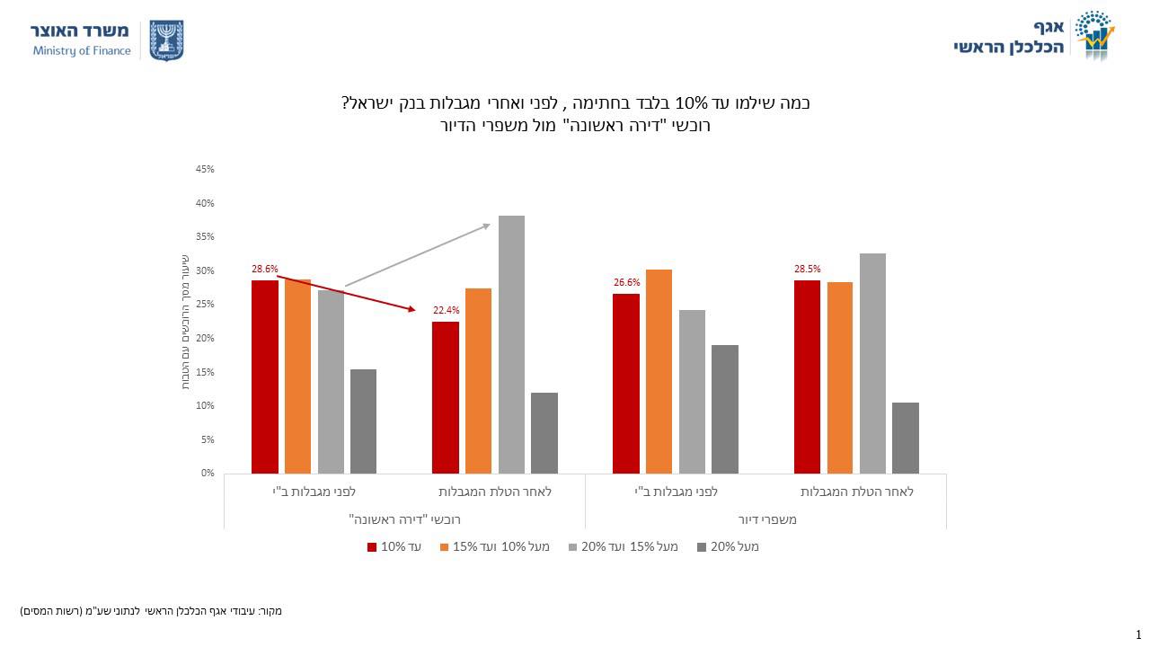 בתרשים הזה נערכה השוואה לפני הטלת מגבלות בנק ישראל על הטבות המימון (ינואר- מרץ) לבין שלושת הרבעונים האחרים. ברבעון הראשון 29% מרוכשי דירה ראשונה, שעשו זאת עם הטבות מימון, שילמו עד 10% בלבד ממחיר הדירה במועד החתימה. זאת לעומת 27% בלבד ממשפרי הדיור, אוכלוסייה המאופיינת ברמות הכנסה גבוהות יותר והון עצמי גבוה יותר.