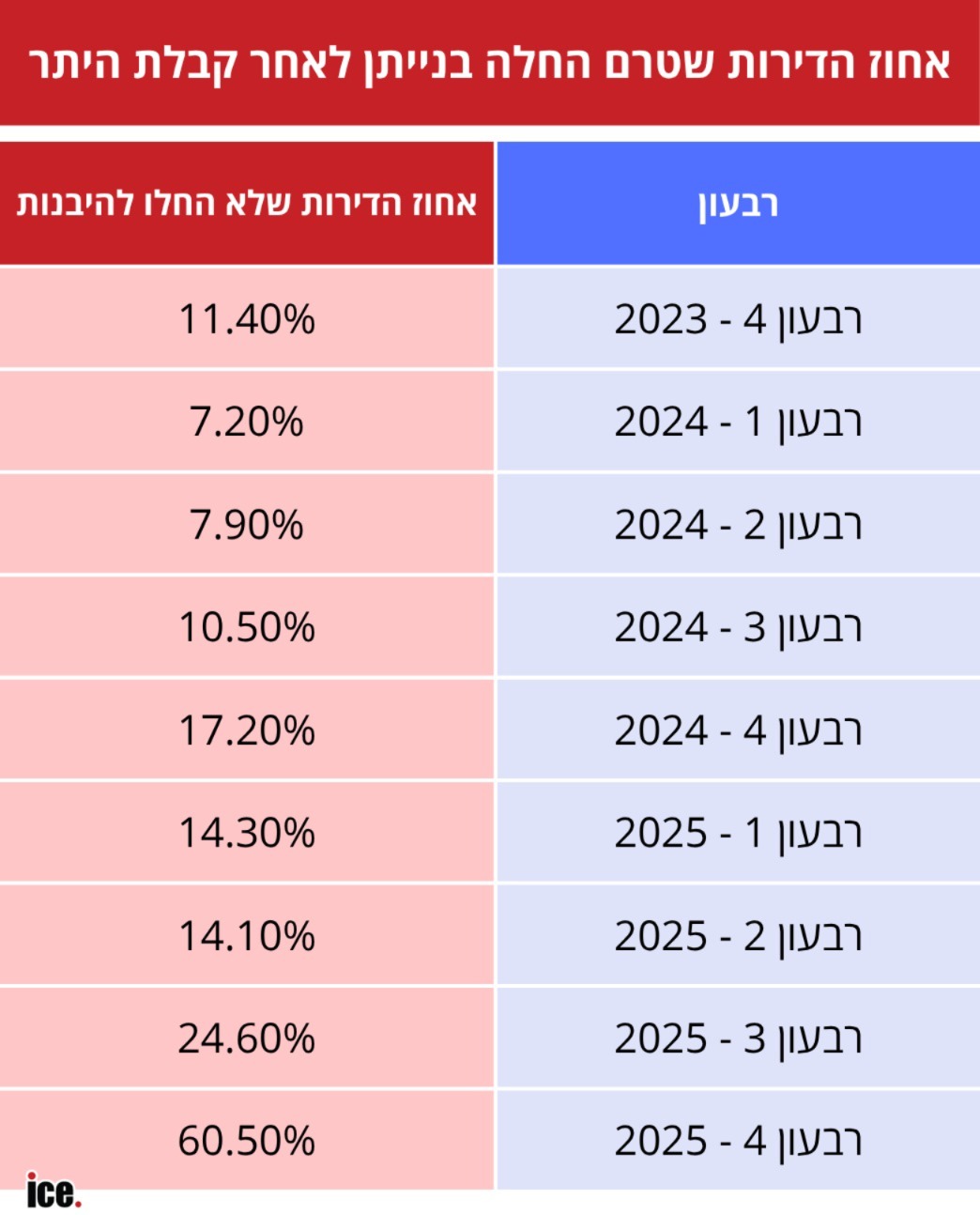 אחרי שהבנו כי רוב מוחלט של יחידות הדיור המאושרות טרם הגיעו לשלב עליית הטרקטורים על הקרקע, כמה מילים על הנתונים לרבעון הרביעי של שנת 2025. על פי התרשים, 60.5% מהדירות שקיבלו היתר בנייה באוקטובר-דצמבר האחרונים, טרם החלו בבנייה בפועל. מדובר בזינוק חד לעומת רבעונים קודמים (כמו רבעון 3 שבו "רק" 24.6% טרם החלו להיבנות).