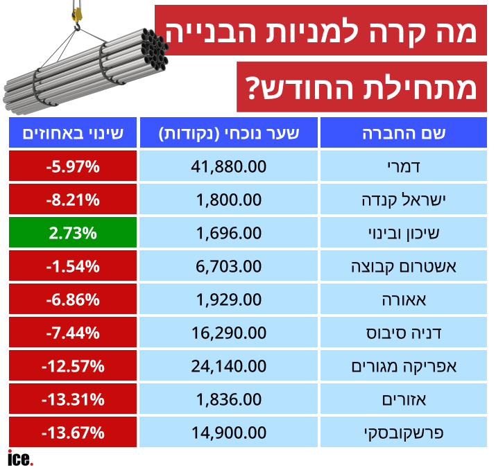 אז מה עשו המניות הגדולות מתחילת מרץ? דמרי ירדה בכ-6%, ישראל קנדה רשמה ירידה של 8.2%, שיכון ובינוי עלתה ב-2.7%, אשטרום רשמה ירידה של כ-1.5%, ואאורה ירדה בשיעור של כ-6.9%. מספר מניות רשמו ירידה של 15% ומעלה: מדובר במניות חברות שחלקן מוכרות מאוד, כמו עמרם, שובל, קרסו ולוינשטיין הנדסה. גם דוניץ, פרשקובסקי, אזורים ואפריקה מגורים ירדו בשיעור דו ספרתי - מה שגורם לקרן הסל הזו לעלות.