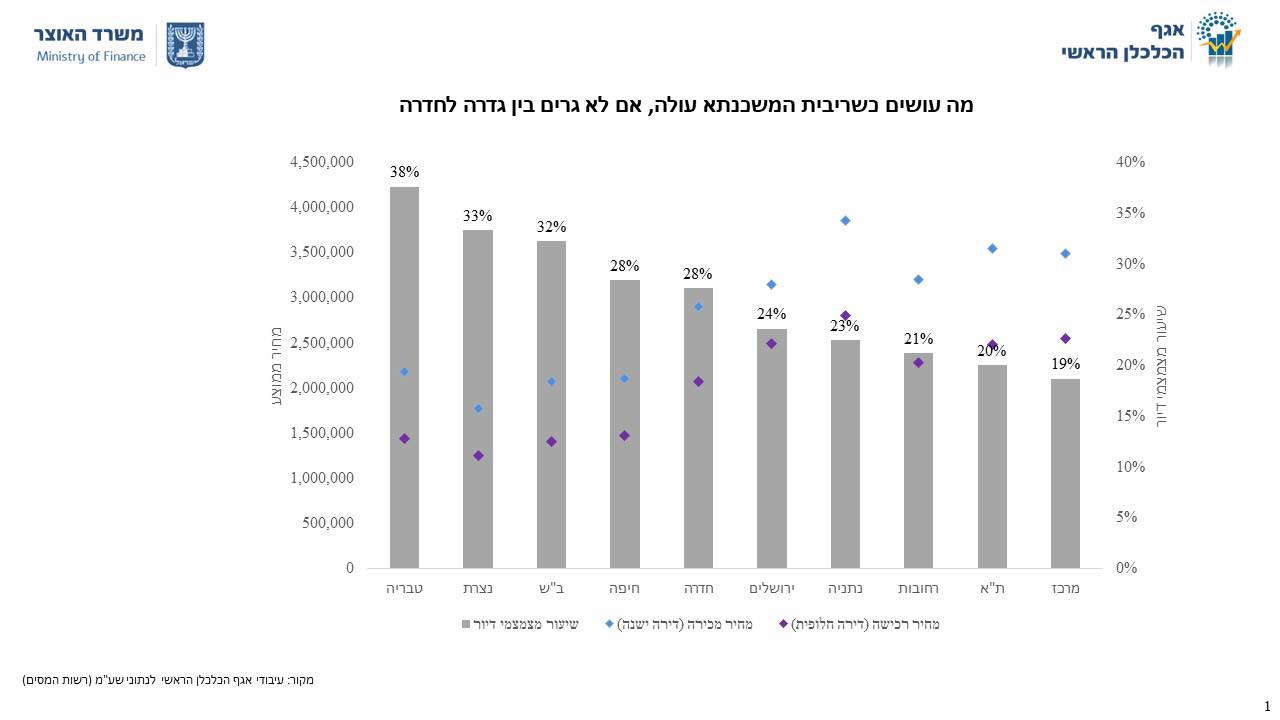 היא הזכירה כי כשבוחנים את התופעה לפי אזורים, המושג "בין גדרה לחדרה" מקבל ביטוי נוסף. ניתוח מראה כי בעוד שבפריפריה נע שיעור מצמצמי הדיור בין 38%-28%, באזורי הביקוש במרכז הוא נע סביב 20% "וגם זה במידה מסוימת מוטה כלפי מעלה".
