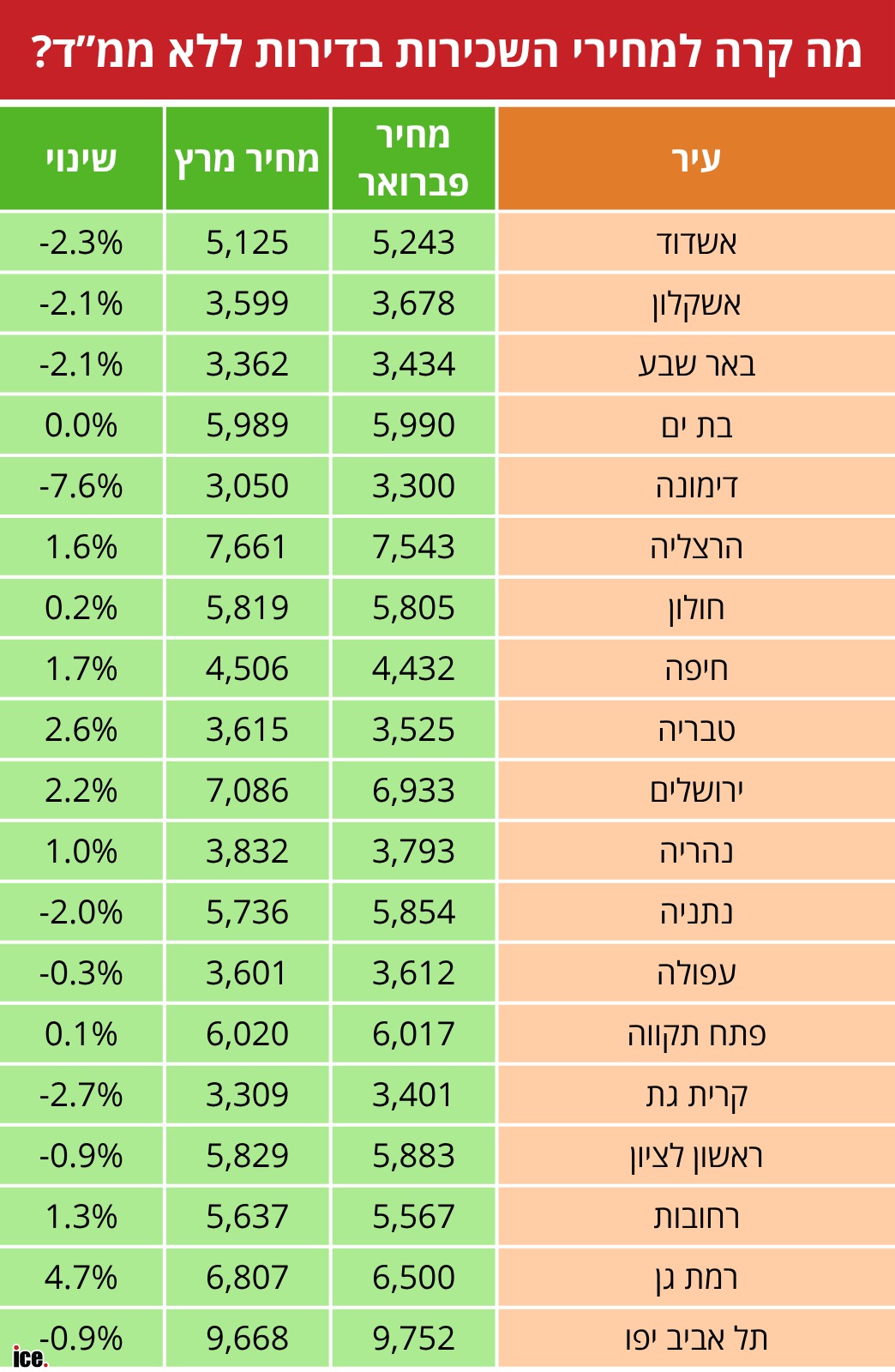 בעזרת נתוני אתר יד2, בדקנו מה קרה למחירי השכירות במהלך המלחמה הנוכחית בלבד. כלומר, לקחנו את מחירי השכירות בערים השונות, בדירות ללא ממ"ד בלבד, בחודש פברואר (חודש לפני תחילת "שאגת הארי", שהחל למעשה ביום האחרון של פברואר, יום שבת שבו לא נעשו עסקאות) - ובדקנו מה קרה בחודש מרץ, חודש המלחמה. את המגמה תוכלו לראות בעצמכם: מי ששוכר דירה ללא ממ"ד משלם פחות ברוב הערים. בעלי הדירות יודעים שהביקוש נמוך בתקופה הזאת ולכן הם משכירים את הדירה מהר.