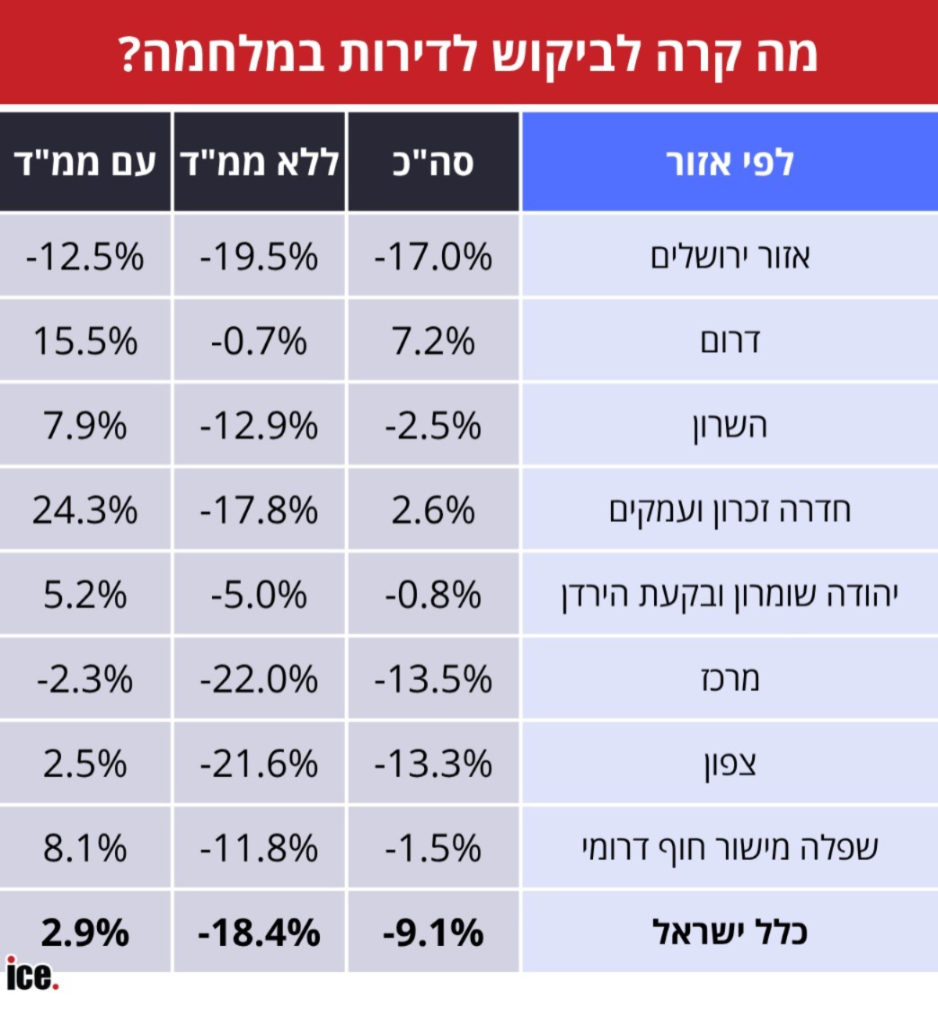 בינתיים, נתונים חדשים מלמדים איך הושפע הביקוש לדירות שכורות באזורים שונים ברחבי הארץ בתוך המלחמה, מקיומו של ממ"ד. בעזרת נתוני יד2, בדקנו מה קרה לביקוש לדירות הללו בכל אזור ואזור בארץ. בהמשך נביא לכם גם נתונים מערים נבחרות, אבל כפי שבטח לא תופתעו לשמוע - הביקוש לדירות עם ממ"ד עולה, בעוד שהביקוש לדירות לא ממוגנות יורד בערים מסוימות.
