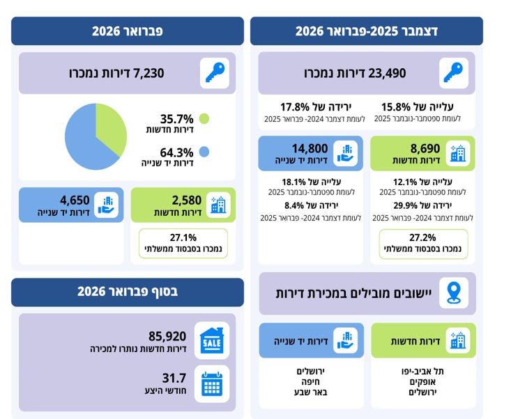 בחודש פברואר בלבד נמכרו 7,230 דירות, מתוכן 35.7% הן דירות חדשות, כ-2,580 דירות. מתוך הדירות החדשות כ-27.1% דירות נמכרו בסבסוד ממשלתי. 64.3% מהדירות שנמכרו הן דירות יד שנייה, כ-4,650 דירות. בלמ"ס בחרו את נתוני המגמה של סך הדירות שנמכרו והם מראים כי מחודש אוקטובר 2021 עד חודש אפריל 2023 נרשמה ירידה בקצב של 3.9% בממוצע בסך הדירות שנמכרו. מחודש מאי 2023 עד מאי 2024 נרשמה עלייה של 2.7% ומחודש יוני 2024 עד פברואר 2026 ירידה חודשית של 0.7%.