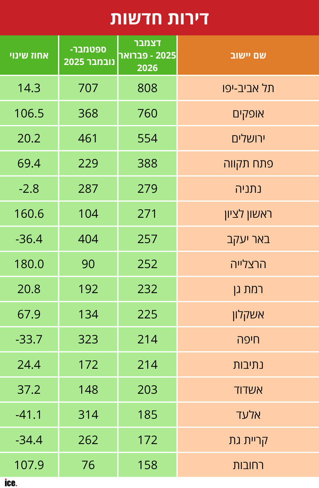 בעזרת נתוני הלמ"ס, בדקנו באילו ערים נמכרו יותר דירות בהשוואה לשלושת החודשים שבהם הסתיימה המלחמה בעזה, אך עדיין לא התחילה המלחמה מול איראן. באוקטובר האחרון חזרו החטופים הביתה, מה שגרם ללא מעט קבלנים למשוך היתרים בתקווה שמשהו ישתנה. אבל אז הגיעה המערכה מול איראן שהחלה בסוף פברואר.
