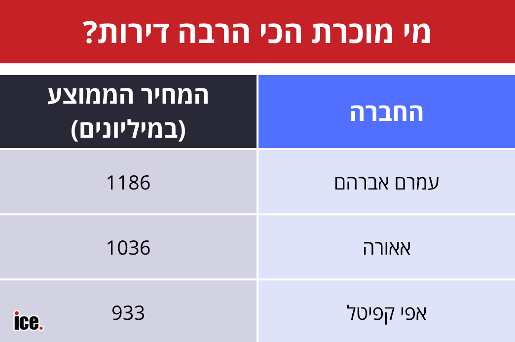 כשמסתכלים על הכמות, ולא רק על ההכנסות, עמרם אברהם מובילה את הטבלה, עם מכירת 1186 דירות. אאורה שניה עם 1,036 דירות. אפי קפיטל מכרה 933 דירות. המחיר הממוצע באאורה הוא 1.83 מיליון שקל, מעט יותר מעמרם (1.7 מיליון שקל) ואפי קפיטל (1.71 מיליון שקל). חברות נוספות: פרשקובסקי מכרה 393 דירות במחיר ממוצע של 2.18 מיליון שקל, שיכון ובינוי מכרה 125 דירות בלבד ב-2.9 מיליון שקל לדירה.