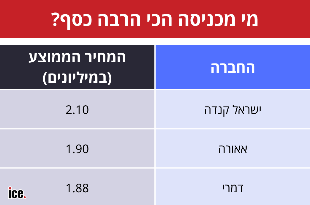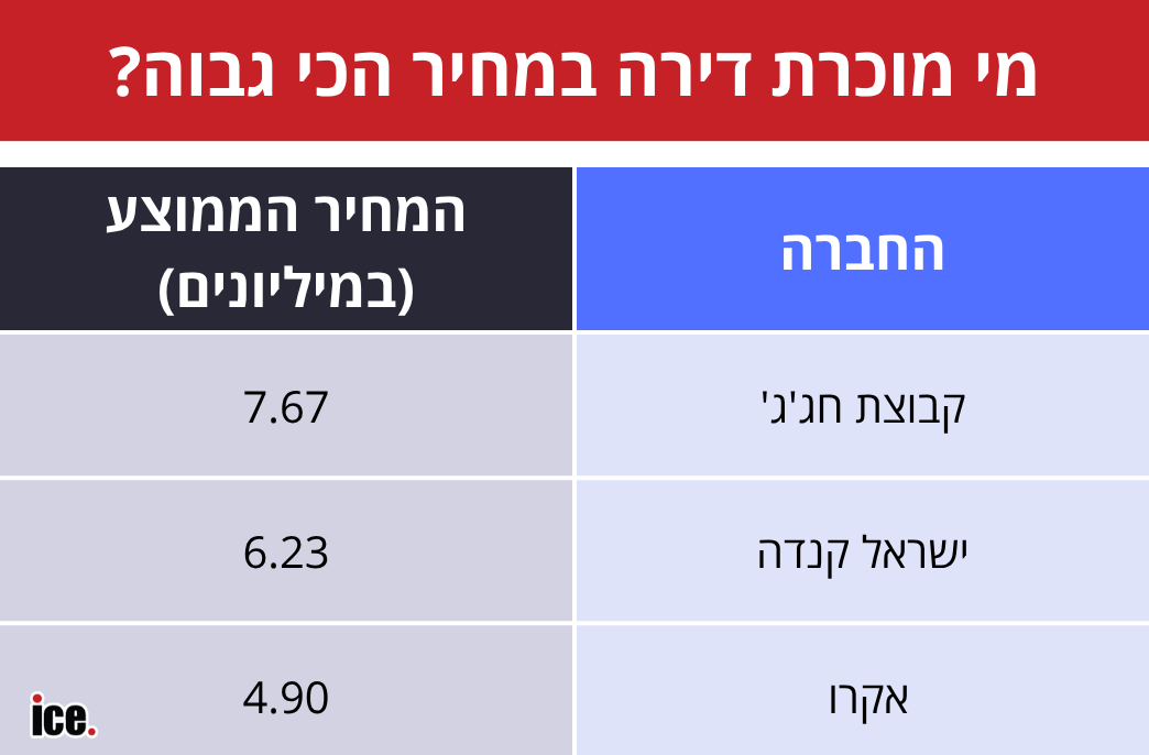 אחד הנתונים החשובים לחברת נדל"ן הוא ההכנסה המצטברת ממכירת דירות והמחיר הממוצע לדירה. במקרה הזה, ישראל קנדה (הכניסה 2.1 מיליארד שקל) וקבוצת חג'ג' (1.65 מיליארד שקל) נמצאות גבוה ברשימה. חג'ג' מכרה 215 דירות, ישראל קנדה 337 דירות, וגם המחיר הממוצע גבוה. חג'ג' מוכרת דירות ב-7.6 מיליון שקל וישראל קנדה בכ-6.2 מיליון שקל. אלה נתונים שאף חברה לא מתקרבת אליהם.