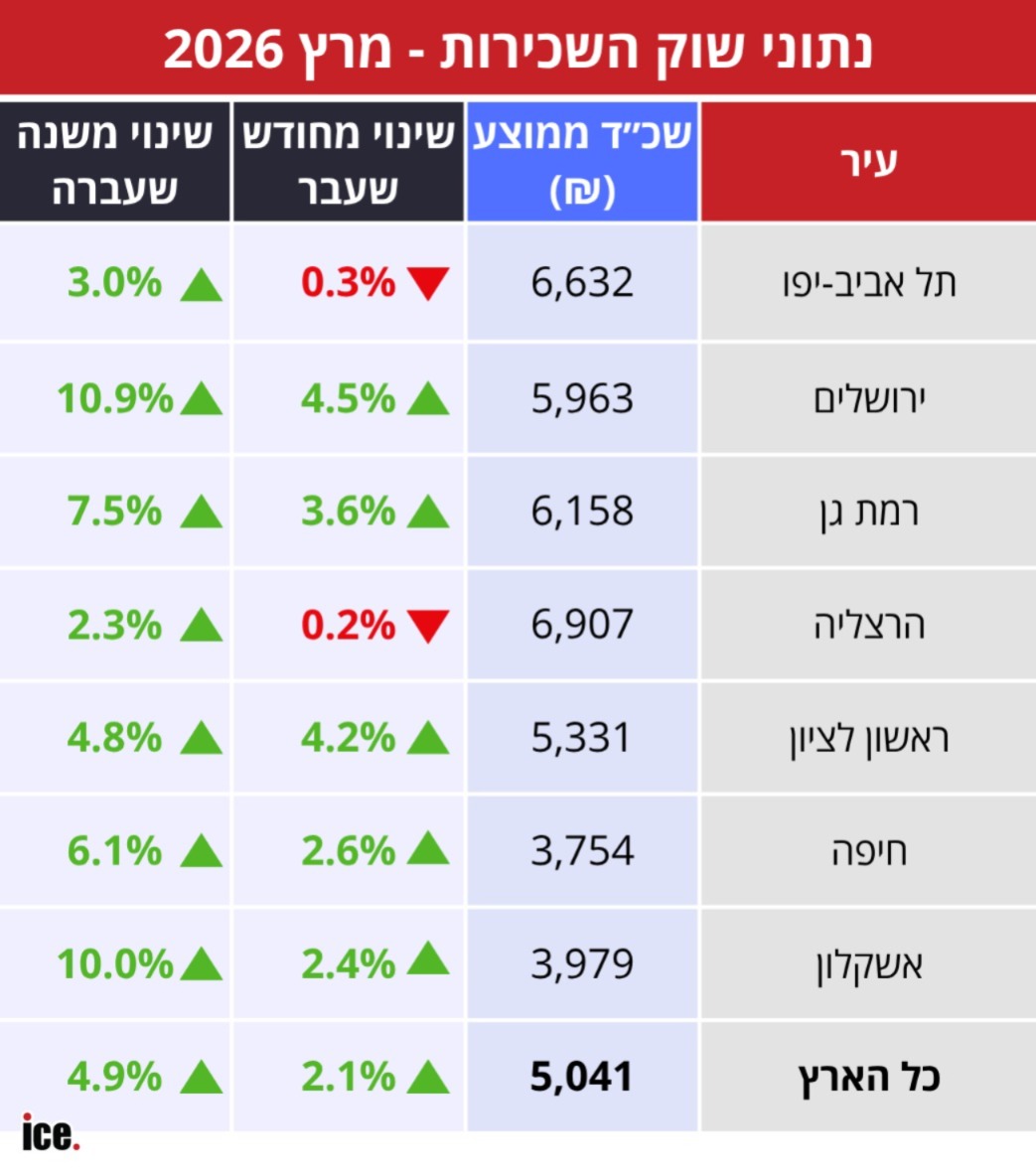 ברמה הכלל-ארצית עלו מחירי הדירות ב-2.1% לעומת החודש הקודם, כאשר שכר הדירה הממוצע עומד כעת על 5,041 שקל. הנתונים מלמדים כי הביקוש לשכירות נותר גבוה, כשמשפחות וזוגות שנאלצו לשכור דירה מניעים את השוק כלפי מעלה.