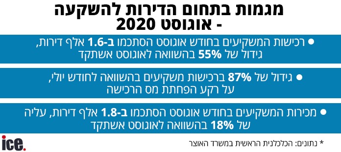 באוגוסט נרכשו 1.6 אלף דירות ע"י משקיעים, גידול של 87% בהשוואה ליולי האחרון, וזינוק של 55% בהשוואה לאוגוסט אשתקד. בין הסיבות: הורדת מס הרכישה