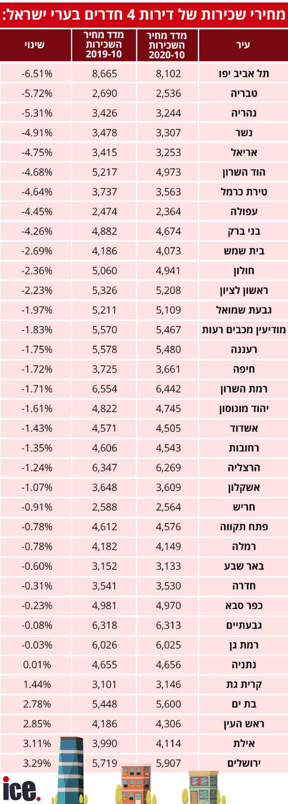 בראש הרשימה נמצאת תל אביב-יפו, בה ירד מחיר השכירות בשיעור ממוצע של 6.5% לעומת אוקטובר 2019. גם בטבריה ובנהריה נעשה קל יותר לשכור דירה. בירושלים ובאילת, לעומת זאת, מחירי השכירות בעלייה