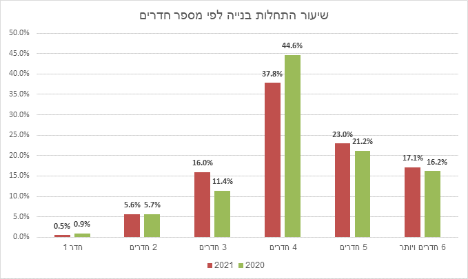 לפי ניתוח נתוני התחלות הבנייה של הלמ"ס שבוצע בלשכת שמאי המקרקעין, במחצית הראשונה של 2021 שיעור הדירות החדשות בנות 4 חדרים שהחלו להיבנות עמד על 37.8% מכלל התחלות הבנייה בתקופה זו, ירידה לעומת שיעור של 44.6% בשנת 2020 ולעומת שיעור ממוצע של כ-40% מאז שנת 1995 ועד היום.