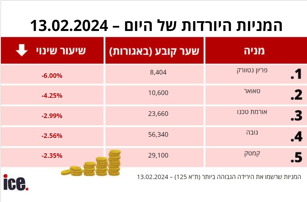 בקרב חמש המניות היורדות של היום, המפסידה הגדולה היא חברת "פריון נטוורק". מנייתה צנחה ב-6.00% לרמה של 8,404 אגורות. מנייתה של חברת "טאואר" צנחה אף היא ברמה משמעותית.