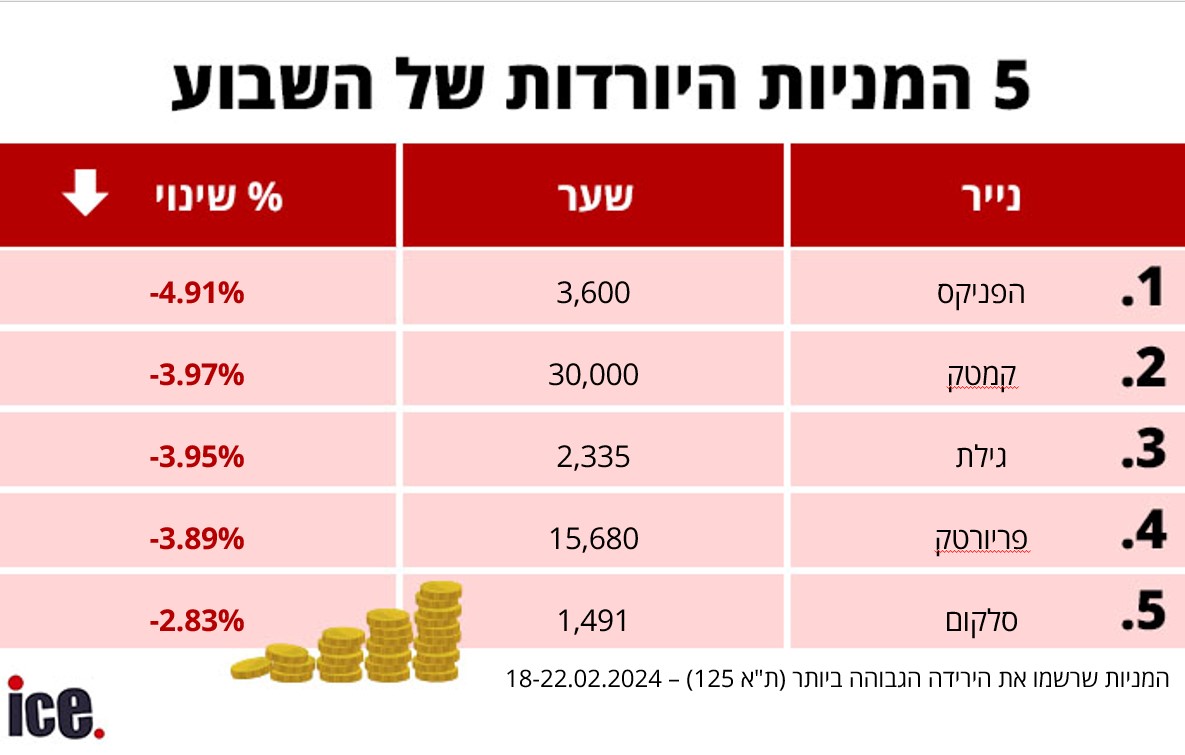 מניית הפניקס ירדה ב-4.91% לרמה של 3,600 נקודות, כאשר אחריה מניית קמטק שירדה ב-3.97% לרמה של 30,000 נקודות. אחריהן נמצאת מניית גילת שירדה ב-3.95% לרמה של 2,335 נקודות, ואחריה מניית פריורטק שירדה ב-3.89% לרמה של 15,680 נקודות. את חמישיית היורדות סוגרת סלקום עם ירידה של 2.83% לרמה של 1,491 נקודות.