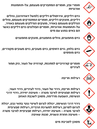 יש לוודא כי קיים סימון בעברית על גבי האריזה של חומרי הניקוי וחומרים כימיים אחרים לשימוש ביתי. הסימון יכלול את הפרטים הבאים: שם היצרן/יבואן, מספר הטלפון שלו וכתובת המלאה, כמות החומר ביחידות מסה למוצקים או ביחידות נפח לנוזלים ולגזים;, מנת הייצור או תאריך הייצור, או תאריך אחרון לשימוש (במקרים רלוונטיים), הוראות שימוש והוראות אחסון, הוראות בטיחות והוראות עזרה ראשונה., כל הסימונים הנ"ל על גבי האריזה חייבים להיות בשפה העברית, ברורים לקריאה ועמידים לשפשוף ולמחיקה.