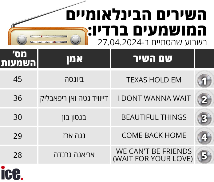שירה של ביונסה הנקרא "TEXAS HOLD 'EM" ממשיך לככב במקום הראשון בקטגוריית השירים הבינלאומיים המושמעים ביותר. הלהיט זכה ל-45 השמעות במהלך השבוע האחרון.