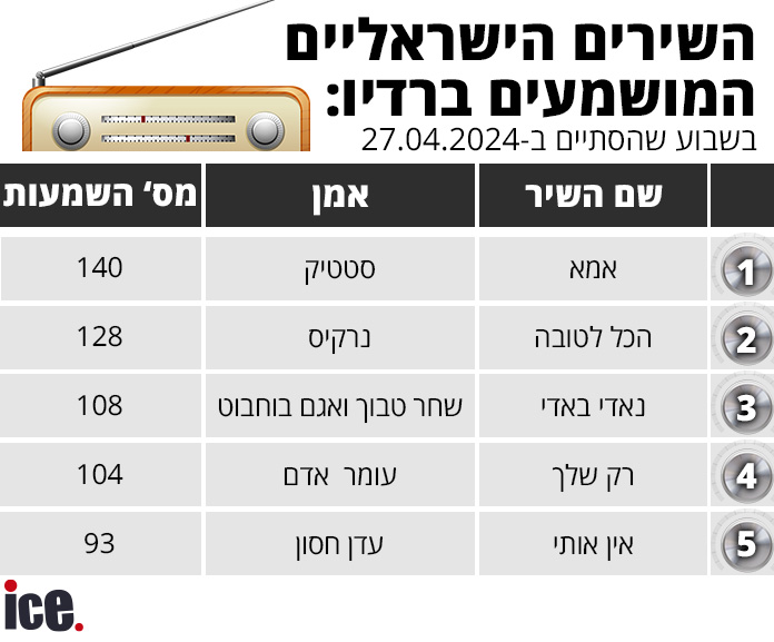 אייל גולן ממשיך לככב במקום הראשון בקטגוריית האמנים הישראליים המושמעים ביותר. שירו של סטטיק הנקרא "אמא" ממשיך לשמור על המקום הראשון כשיר הישראלי המושמע ביותר במהלך השבוע האחרון