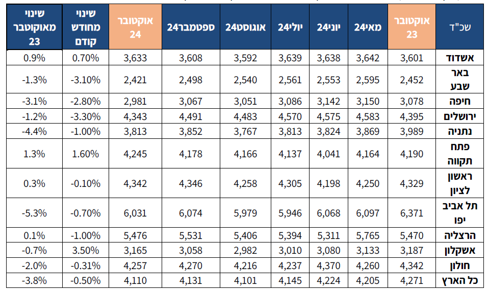 בהסתכלות על הערים השונות במחירי הדירות, בולטת במיוחד ירידה חדה בחיפה של 2.9% בהשוואה לחודש שעבר, ירידה שמיוחסת למצב הביטחוני המתוח בצפון. לעומת זאת, ירושלים דווקא מציגה עלייה של 2.0% במחירים, ואשדוד עם עלייה של 1.1%. בתל אביב נמשכת מגמת הירידה העקבית עם ירידה נוספת של 0.2% החודש, ובהשוואה לאוקטובר אשתקד מדובר בירידה משמעותית של 3.4%.