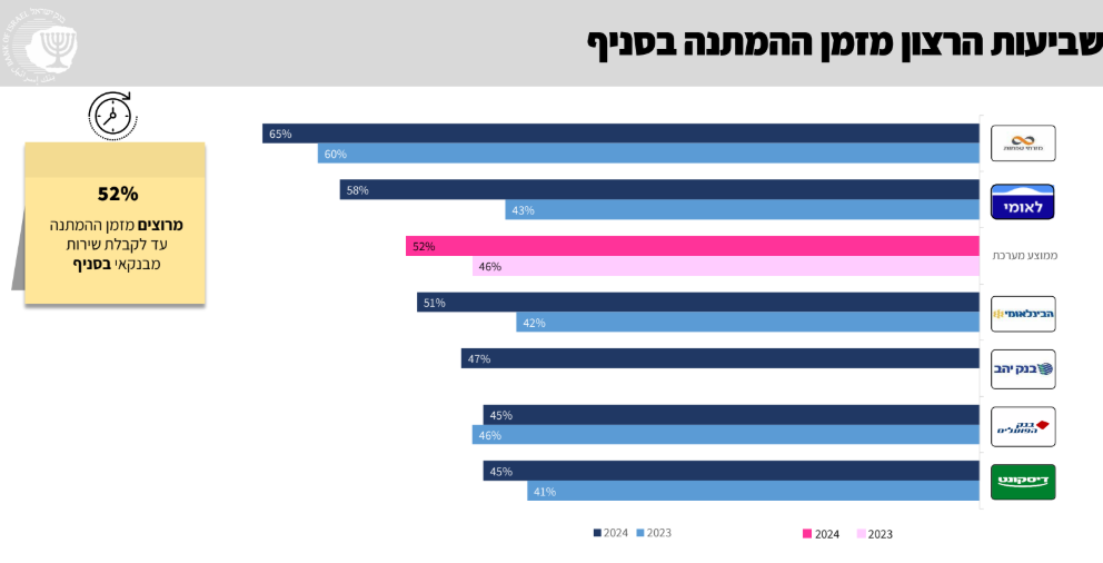 כמו כן, מהסקר לשנת 2024 עולה כי בממוצע חל שיפור בשביעות רצון לקוחות המערכת הבנקאית וחברות כרטיסי האשראי, אך ישנה שונות בין הגופים השונים וערוצי השירות השונים. על פי הממצאים העיקריים שעולים מסקר שביעות רצון של משקי הבית לשנת 2024, בהשוואה לממצאי הסקר שבוצע בשנת 2023, תפיסת הוגנות המערכת הבנקאית עלתה ל61% לעומת 54% בסקר הקודם.