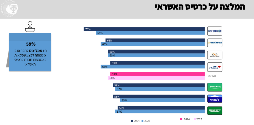 בפרק ההמלצה על כרטיסי אשראי בסקירה של בנק ישראל, בנק יהב במקום הראשון ומוביל על הבינלאומי שבמקום השני, מזרחי טפחות שבמקום השלישי ובנק הפועלים שבמקום הרביעי. מתחת לממוצע של 59% נמצאים בנק מרכנתיל, בנק לאומי ודיסקונט.