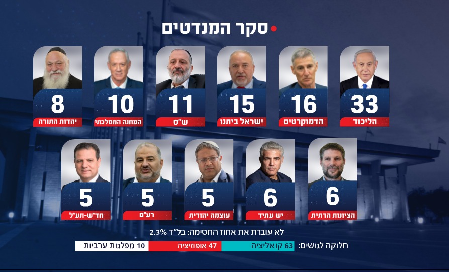 הציונות הדתית של בצלאל סמוטריץ' עולה מעט ומקבלת 6 מנדטים, בדיוק כמו יאיר לפיד ויש עתיד שמתרסקים לחלוטין. מי שעוד רשם התרסקות טוטאלית הוא איתמר בן גביר ומפלגתו עוצמה יהודית, שצנחו ל-5 מנדטים, בדיוק כמו המפלגות הערביות, רע"מ וחד"ש תע"ל.