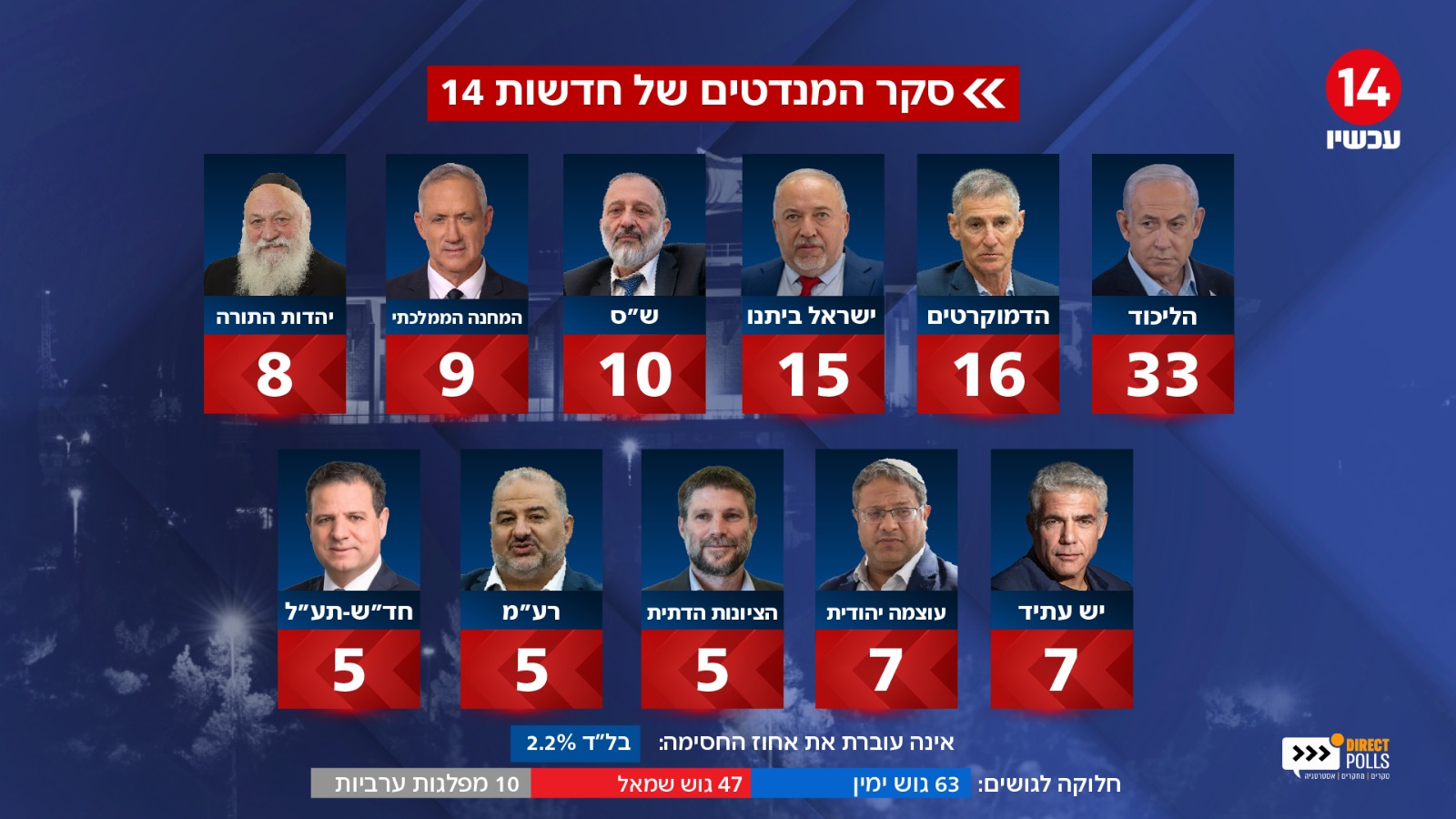 סקר חדש של ערוץ 14 מראה כי ראש הממשלה ממשיך להוביל בתמיכה לראשות הממשלה; גוש הימין שומר על יתרון משמעותי