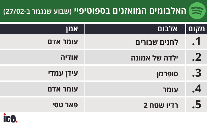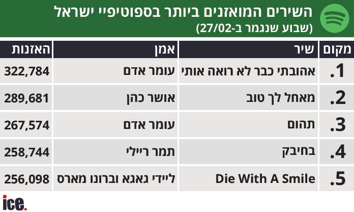 גם השבוע עומר אדם שומר על נוכחות מרשימה בכל הטבלאות. אושר כהן שומר על מקומו כמו אודיה, ששומרת על המקום השלישי בטבלת האומנים המואזנים | דירוג ספוטיפיי של Ice