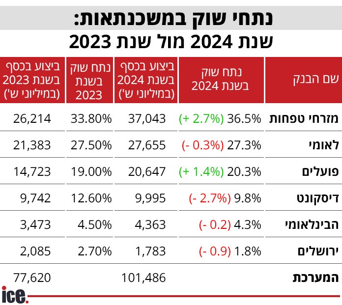 נתח השוק של בנק מזרחי טפחות, הבנק הגדול בתחום המשכנתאות, עלה בשנת 2024 ל-36.5%, זאת לעומת 33.8% מהשוק ב-2023. שניים מבין הבנקים למשכנתאות הצליחו להגדיל בשנה החולפת את נתח השוק. הבנק השני הוא בנק הפועלים, שגדל מנתח שוק של 19% ל-20.3%.