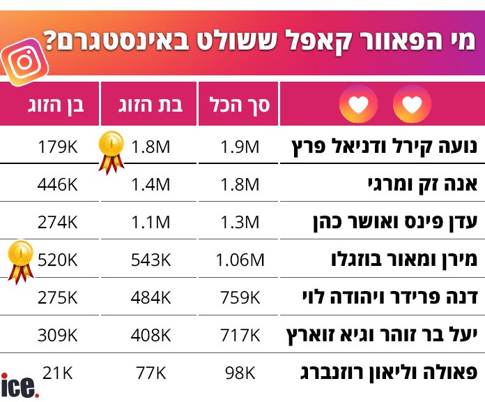בעידן בו בודקים בזכוכית מגדלת את מספר העוקבים שיש לכל אמן או מפורסם בארץ, יש מקום לבדוק גם את שילוב הכוחות של הזוגות ולבדוק מה מספר העוקבים שהם מגיעים אליו ביחד. באופן לא מפתיע הנשים ברשימה שלנו עקפו, כל אחת בתורה, את בני זוגן. מי הזוג שנמצא בראש הטבלה ואיזה זוג נשאר הרחק מאחור?