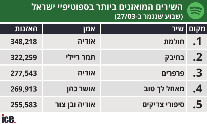 אודיה תופסת 3 מקומות בטופ 5 של השירים המואזנים, ושתי כניסות חדשות ומפתיעות ברשימת האלבומים| דירוג ספוטיפיי של Ice
