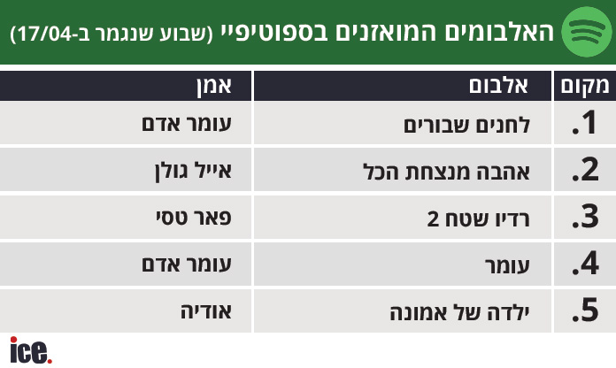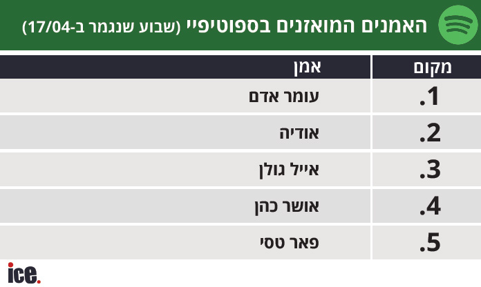 בדירוג הספוטיפיי השבועי, עומר אדם שומר חזק על הצמרת, בעוד שאודיה נושפת לו בעורף במשך השבועיים האחרונים ומסיימת במקום השני. אייל גולן ממשיך להנות מהצלחת האלבום החדש ונועל את השלישייה הראשונה.