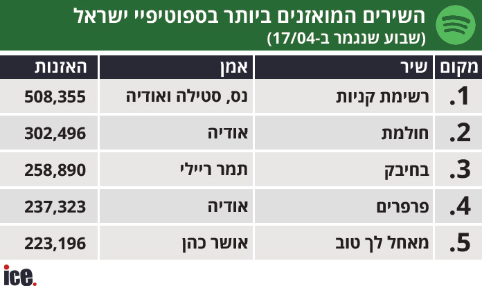 השיר המואזן ביותר בשבוע החולף היה "רשימת קניות" של נס סטילה ואודיה, ששומר על הכתר, עם מעל חצי מיליון האזנות (508,355). אודיה מתחרה בעצמה, ומכניסה עוד שיר לשלישייה הראשונה, "חולמת" שלה הגיע ל-302,496 האזנות.