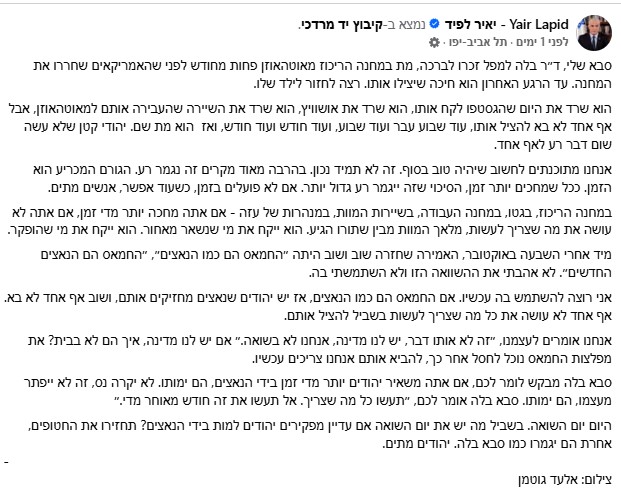 הפוסט של יאיר לפיד, יו"ר מפלגת "יש עתיד", זכה לתגובות ולייקים רבים. בפוסט שפרסם אמש (חמישי) בחשבון הפייסבוק שלו, כתב לפיד: "סבא שלי, ד״ר בלה למפל זכרו לברכה, מת במחנה הריכוז מאוטהאוזן פחות מחודש לפני שהאמריקאים שחררו את המחנה. עד הרגע האחרון הוא חיכה שיצילו אותו. רצה לחזור לילד שלו.