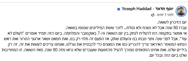 עוד כתב יוסף חדאד: "אז הפעם זה תלוי רק בנו, ואת חמאס ושאר ארגוני הטרור ואת ראש הנחש המשטר האיראני צריך להכריע כמו את הנאצים כדי להבטיח את גורלנו, ואנחנו צריכים לעשות את זה, זה רק בידיים שלנו. ואת אחינו החטופים נצטרך להציל מהזוועות שעוברים שלא נראו מזה 80 שנה, מאז השואה. זו המחויבות שלנו ביום הזה ובכל יום".