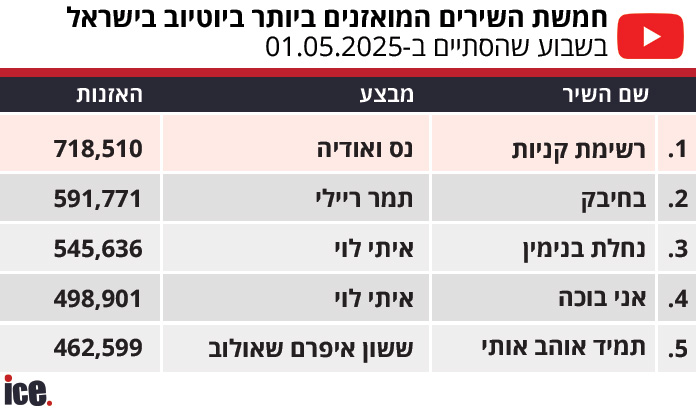 דירוג יוטיוב של ice על נתוני האזנות בשבוע החולף מציג סטטוס קוו בצמרת. בגזרת הזמרים המואזנים ביותר בישראל שולט ללא עוררין אייל גולן, שהמופע שלו כבר הספיק לשבור שיאי מכירות. גולן משאיר אבק לכל הזמרים האחרים בישראל, אחרי ששיריו זכו השבוע ל-5,566,482 צפיות והוא רושם שבוע נוסף בפסגה.