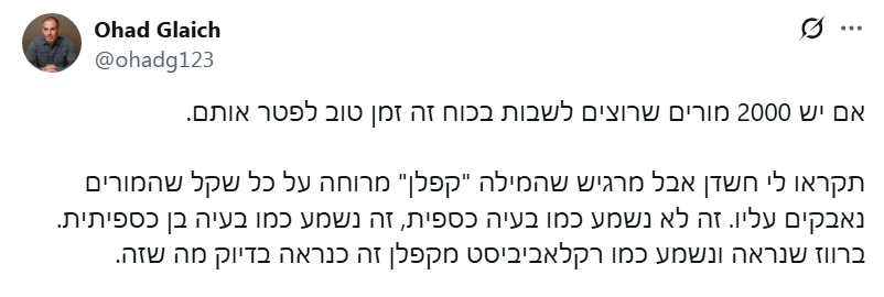 1.אף אחד לא כועס על המורים, מספיק להפיץ הודעות מטעםסמי 05/2025/07הגב לתגובה זו0 0להיפך, אנחנו רוצים מורים מאושרים כי אנחנו יודעים שהילדים יסבלו עם מורים ממורמרים או אם חלק מהמורים יתפטרו ואלה שנשארו יאלצו לשאת את האלונקה.סגור