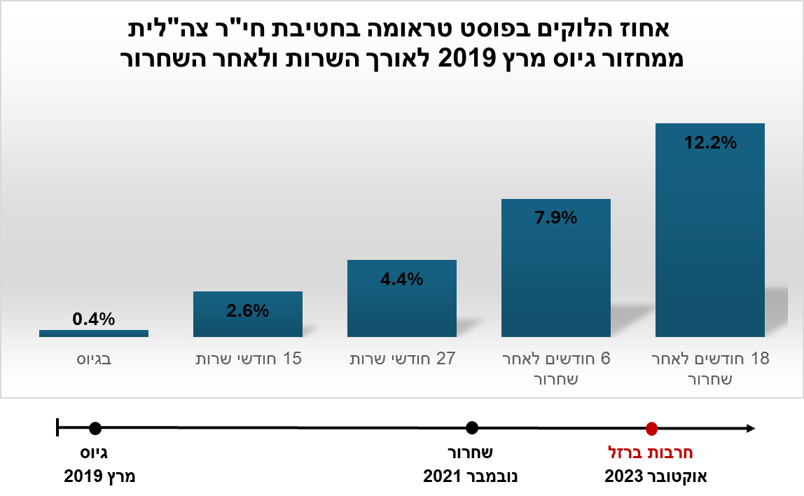 מתוצאות המחקר עולה שבתחילת השירות פחות מחצי אחוז מהמתגייסים סבלו מפוסט-טראומה. אחרי כשנה וחצי בצבא, כלומר בתום חצי שנה של הכשרה קרבית ועוד כתשעה חודשים של פעילות מבצעית, המספר עלה ל-2.6%. לקראת סוף השירות הסדיר, כלומר לאחר מספר סבבים נוספים של פעילות מבצעית, האחוז עמד על 4.4%. חצי שנה אחרי השחרור מצה"ל זוהתה עלייה נוספת בתסמינים וכמעט 8% מלוחמי המחזור הנחקר דיווחו על תסמיני פוסט טראומה. אחרי פרוץ מלחמת חרבות ברזל מספר המשתתפים שדיווחו על סימפטומי פוסט טראומה עלה לכ- 12%.