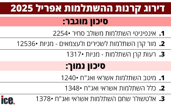 בסיכון הגבוה, אינפיניטי שומרת על המקום הראשון בדירוג חודש שני ברציפות עם המסלול אינפיניטי השתלמות משולב סחיר•2254, בזכות ביצועים מרשימים במיוחד בתשואת 12 החודשים האחרונים. לעומת זאת, אינפיניטי השתלמות מניות•1537, שדורג שני בחודש שעבר, ירד משמעותית בעקבות ביצועים חלשים מאוד בחודש האחרון, מהנמוכים ביותר בקטגוריה. את מקומו תפסה מור, שנכנסה לשלישייה המובילה עם המסלול מור קרן השתלמות לשכירים ולעצמאים - מניות•12536, הודות לתשואת 5 שנים פנטסטית שמבליטה את המסלול בטווח הארוך. את המקום השלישי בדירוג תפס המסלול רעות קרן השתלמות - מניות•1317, שהציג אף הוא ביצועים חזקים בטווח של 5 שנים, ודחק החוצה את קרן השתלמות למשפטנים - מסלול מניות•1454, שאיבד גובה לאחר ירידה חדה של כ-6% בחודש מרץ – מהחלשות בקטגוריה. לאור התחזקות הדולר בכ-3.5% מול השקל, מסלולים שהחזיקו ניירות ערך בחשיפה מלאה לשקל הציגו לרוב ביצועים חלשים משמעותית.