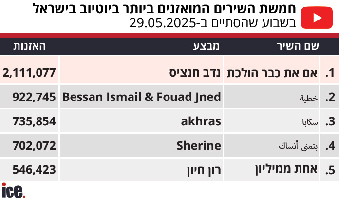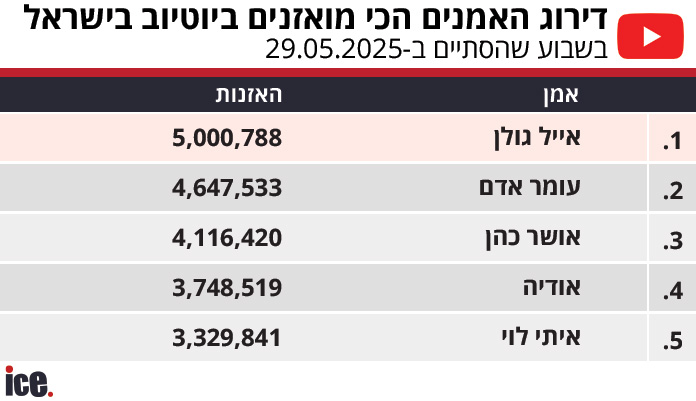 בדירוג יוטיוב ישראל של השבוע החולף, אייל גולן נשאר יציב במקום הראשון עם מעל 5 מיליון האזנות בפלטפורמה (5,000,788 האזנות). במקום השני, סיים עומר אדם עם 4,647,533 האזנות. את השלישייה הראשונה סגר אושר כהן, שעלה מהמקום הרביעי והחליף את הזמרת אודיה, שעשתה את הדרך ההפוכה. כהן סיים עם 4,116,420 האזנות, ואודיה עם 3,748,519 האזנות.