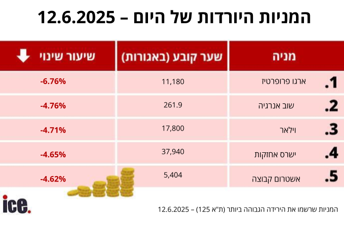 את רשימת המניות היורדות של היום פותחת ארגו פרופרטיז שירדה בשיעור של 6.76% לרמה של 11,180 נקודות. במקום השני נמצאת שוב אנרגיה שירדה בשיעור של 4.76% לרמה של 261.9 נקודות. וילאר במקום השלישי לאחר שירדה בשיעור של 4.71% לרמה של 17,800 נקודות. ישרס אחזקות במקום הרביעי עם ירידה בשיעור של 4.65% לרמה של 37,940 נקודות. את החמישייה סוגרת קבוצת אשטרום עם ירידה של 4.62% לרמה של 5,404 נקודות
