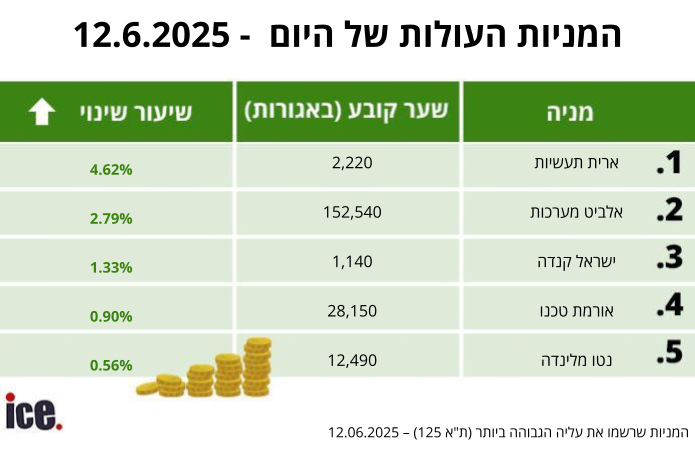 את רשימת המניות העולות של היום פותחת אריח תעשיות עם עלייה בשיעור של 4.62% לרמה של 2,220 נקודות. אלביט מערכות מיד אחריה עם עלייה של 2.79% לרמה של 152,540 נקודות. במקום השלישי נמצאת ישראל קנדה עם עלייה של 1.33% לרמה של 1,140 נקודות, במקום הרביעי אורמת טכנו שעלתה בשיעור של 0.90% לרמה של 28,150 נקודות. את החמישייה סוגרת נטו מלינדה שעלתה בשיעור של 0.56% לרמה של 12,490 נקודות.