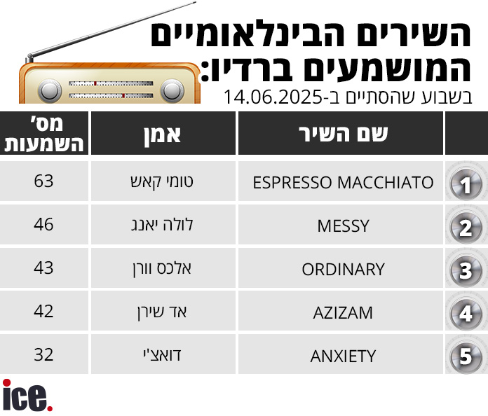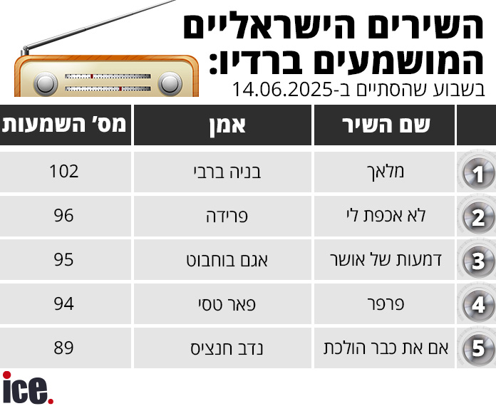 שוב מהפך בראש דירוג תחנות הרדיו של ice: לאחר ששבוע שעבר שלמה ארצי עקף אותו בדירוג, אייל גולן מחזיר לעצמו את ההובלה, הרבה בזכות ההופעה ביום חמישי באצטדיון בלומפילד, ממש רגע לפני שהחלה המלחמה עם איראן. את הזמר השמיעו לא פחות מ-470 פעמים. במקום השני והמפתיע ניצב פאר טסי עם 438 השמעות, איתי לוי תופס את המקום השלישי עם 392 השמעות, לפני עומר אדם ואודיה שסוגרים את החמישייה הפותחת עם 387 ו-379 השמעות בהתאמה.