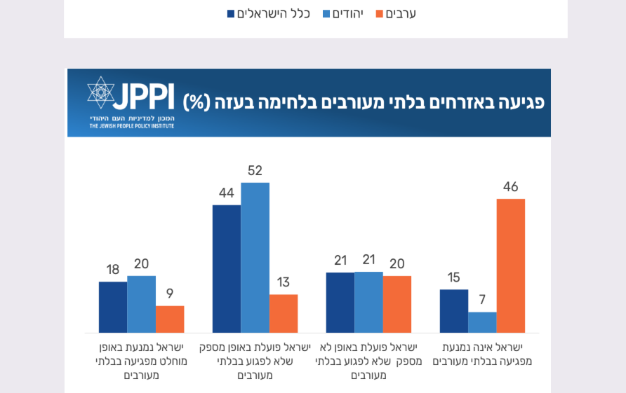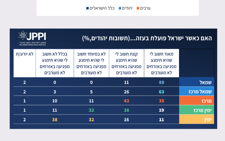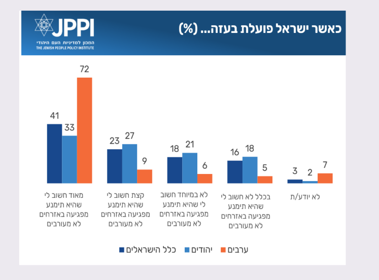 לעומתם, שני שליש מהציבור הערבי בישראל סבורים שישראל אינה נזהרת מספיק או כלל לא נזהרת. ככל שעוברים מהשמאל אל הימין-עולה האמון בפעולות צה"ל, ויורדת הדאגה המוסרית מהשלכות הלחימה.