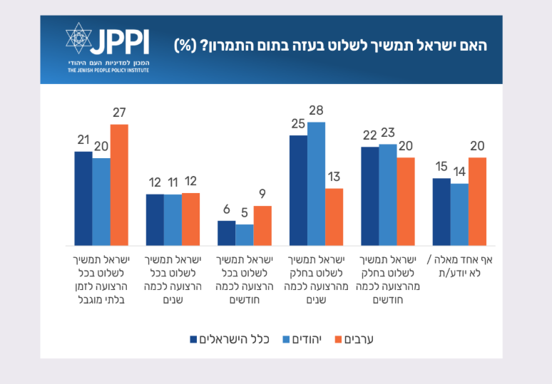 כשנשאלו מה עשוי להיות עתיד השליטה הישראלית ברצועה, כמעט מחצית מהציבור (47%) מאמינים שישראל תמשיך לשלוט בחלק מהרצועה לפחות לכמה חודשים. שליש מהישראלים (33%) מעריכים שישראל תשלוט בכל הרצועה-לפחות לכמה שנים. גם כאן הפילוח הפוליטי מובהק: רוב תומכי מפלגות הקואליציה מעריכים שישראל תשלוט לאורך זמן ברצועה, בעוד שרוב תומכי האופוזיציה מעריכים שהמלחמה תיגמר בשליטה חלקית וזמנית.