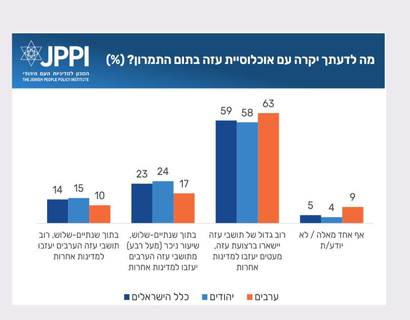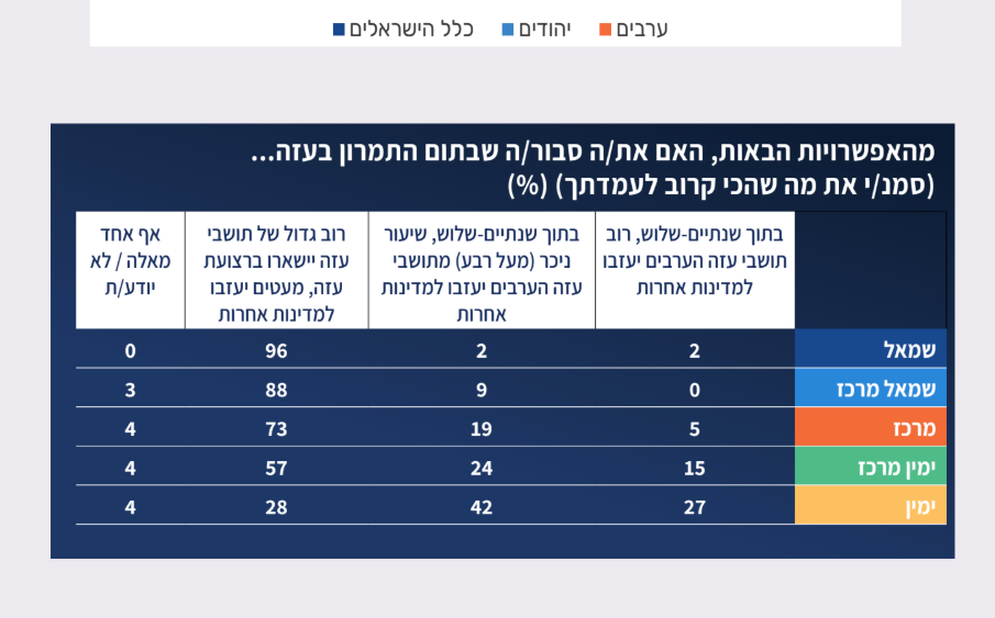 שאלה רגישה נוספת עסקה בשאלה האם תושבי עזה הערבים יעזבו את הרצועה. 59% מהישראלים חושבים שרוב גדול מהעזתים יישארו, ורק 14% צופים עזיבה רחבה. אלא שבקרב מצביעי הימין-יותר מרבע מהם צופים כי רוב העזתים יעזבו בתוך שנתיים–שלוש, ו-42% מאמינים שמעל רבע מהאוכלוסייה תעזוב. מנגד, כמעט כל מצביעי השמאל (96%) מאמינים כי רוב האוכלוסייה תישאר בעזה, ומעטים בלבד יעזבו.